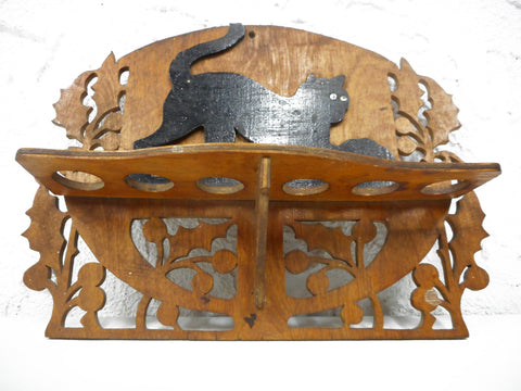 Excellent condition, sturdy, ready to hang your tobacco pipes, keys or telephone. Wood in excellent condition, patina preserved. Measures 9 X 7 inches. Holds up to 6 tobacco pipes. Beautifully hand carved scene of a black cat playing with a ball in a background of Holly leaves and fruits. Tobacco pipes not included.