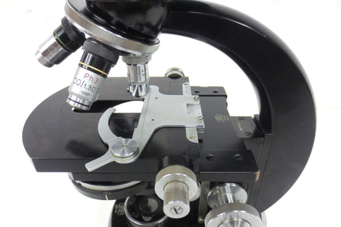 - 4 microscope objectives: Ernst Leitz Wetzlar 1/2 Oel, Carl Zeiss PH1 10/0.22, Carl Zeiss PH2 25/0.45 and a Zeiss Winkel PH3 100/1.30 Oel.