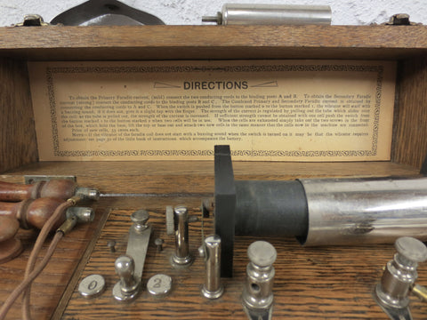 Perfect condition, complete with instructions and accessories, no batteries. Nickel plated controls, main electrode in mint condition. Beautiful solid oak box, one drawer for accessories, the other for cells. Clear instructions on the inside of the box's lid. Box measures 12 X 9.75 X 4 inches.