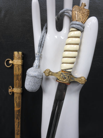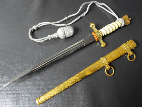 Excellent condition, original brass sheath and decorations. 9 3/4 inches long double sided blade in mint condition, no edge, never sharpened. Total length is 16.5 inches. Dagger was used during WWII German navy military ceremonies. Sheath is covered with hand engraved leafs and crowns and has two uniform fixation rings. Sheath and blade have a sophisticated locking mechanism. Handle guard is very ornate and has a boat anchor on both sides. Handle is white resin with a gold metal spiral. The dagger's butt has a sculpted eagle sitting on the German army emblem.