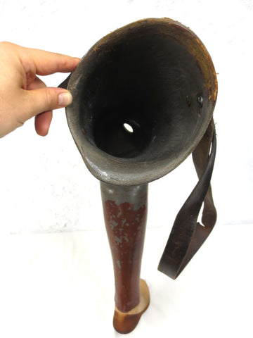 Complete, authentic, no broken parts. Sophisticated bend and lock metal mechanism with a lever and spring. Measures 35 inches long and folds 90 degrees. Original leather strap and details, heavy brass buckle. Made out of solid wood and resin. Weighs 7 pounds. High quality and quite expensive to make in the late 1900's, early 1910.