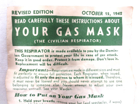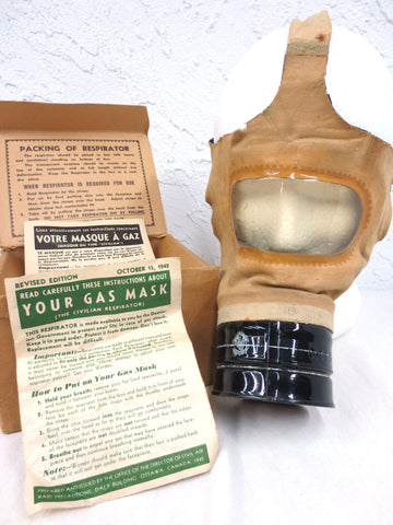 Original instructions, box and mask dated October 15th, 1942. Box and instructions in excellent condition. Mask is complete, shows age but is still sturdy. This civilian respirator was given to the general population for protection in case of gas attack, by the Dominion Government of Canada. Instructions are both in English and French. Found in Montreal, Quebec, Canada.