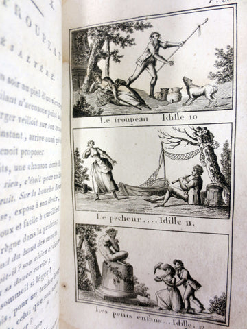 First edition kid's book dated 1802, original leather cover and binding intact. Written for kids by Berquin, 24 beautiful lithographies, published in Paris by Leprieur. An Idyll is a simple poem describing country life. From the private collection of late Doctor L.E. Fortier in Montreal, Quebec, Canada. Interior cover page is hand signed by a previous owner or seller. 144 pages, measures 4 1/4 X 6 5/8 inches.