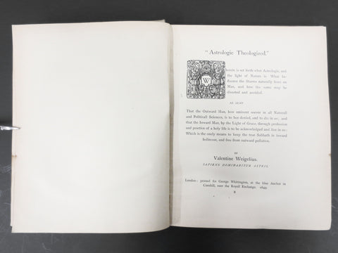 Original and complete, excellent condition, sturdy binding. Signed and donated by the founder of the Molson Brewery to the now closed Fraser Institute Library in Montreal. Written in 1886 by Anna Bonus Kingsford, Dr of Medicine of the Paris Faculty and President of the Hermetic Society. Book contains beautiful engravings and is entitled "Astrology Theologized, The spiritual Hermeneutics of Astrology and Holy Writ being A Treatise Upon the Influence of the Stars on Man and on the Art of Ruling them by the Law of Grace". Published by George Redway in London in 1886. Reprinted from the original of 1649. Cover shows a purple stain. Book measures 6 7/8 X 8 1/2 inches.