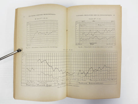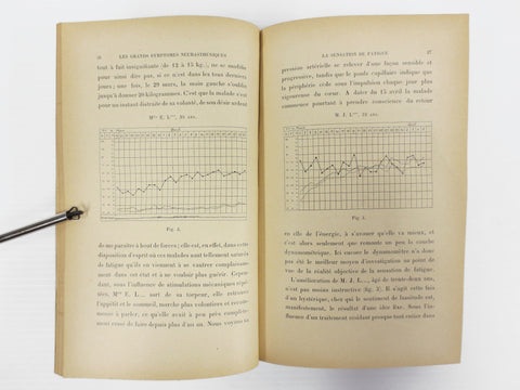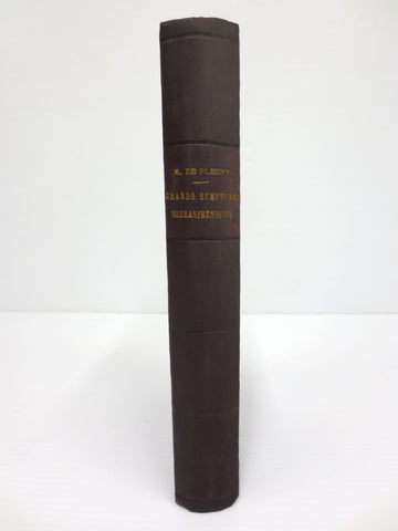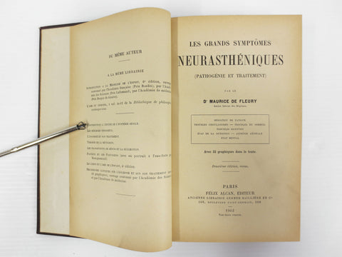 Excellent condition, complete, sturdy binding. French medical book entitled "Les Grands Symptômes Neurasthéniques, Pathogénie et Traitement" which means "Major Neurasthenic Symptoms, their Pathology and Treatment". Written by Dr Maurice de Fleury, ex Paris Hospitals Intern. Published in 1902 by Félix Alcan (Baillière). Book was owned by a renowned Montreal Doctor.