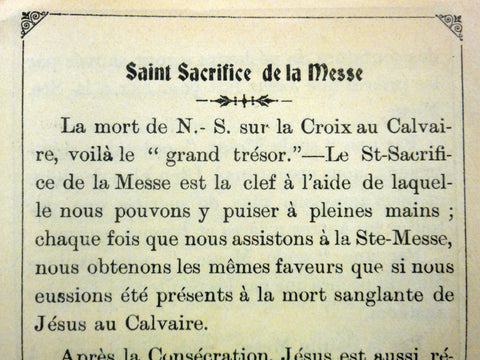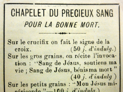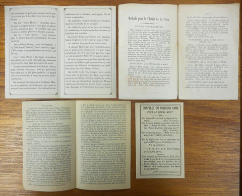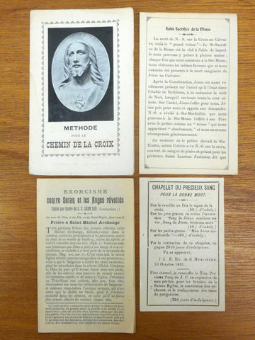 4 authentic and complete booklets in excellent condition. Printed in Paris and Quebec in the 1910's and 1920's, written in French. Psalms and prayers against Satan and Revolted Angles (4 3/4 X 3 inches, 4 pages), Stations of the Cross (5 1/4 X 3 1/4 in, 8 pages), Precious Blood Rosary for a Good Death (4 X 2 3/4 in, 2 pages) and Holy Sacrifice of the Mass (5 X 3 in, 4 pages).