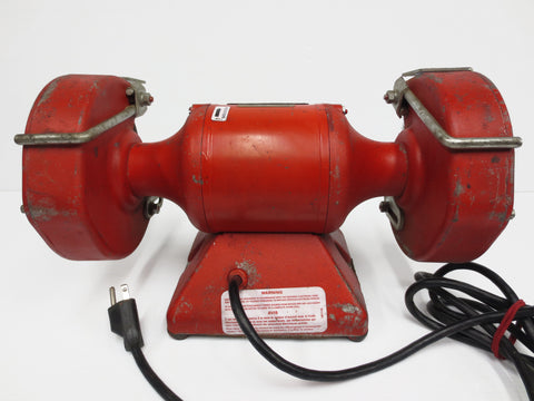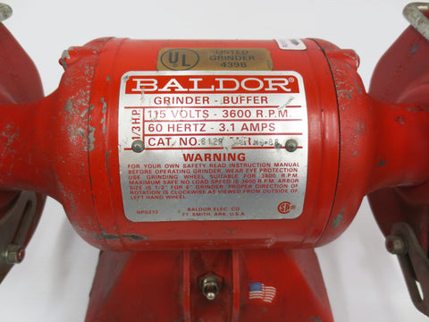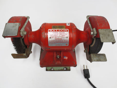 Excellent working condition, very clean, complete. This is a 6" diameter wheels Baldor grinder and buffer model 612R, serial W9-88. Specifications: 1/3 HP split-phase motor, 115 Volts, 3600 RPM, 60 Hertz, 3.1 Amps, 1/2 arbor hole, on/off switch, wheel guards, adjustable stamp-steel tool-rest, spark-breaks and eye-shields. Custom metal plate at the bottom to screw it to your workbench. Some paint loss, otherwise A1 condition.