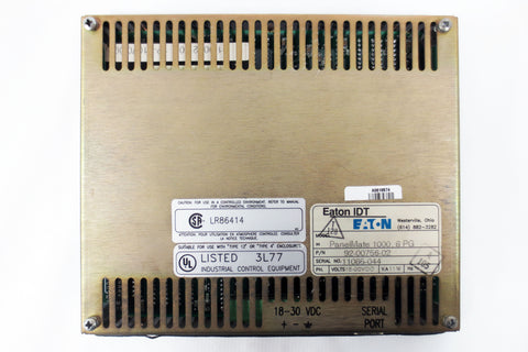Excellent condition, inspected and functional, very clean. Panel Mate 1000 industrial operator interface by Eaton IDT Cutler-Hammer, part no. 92-00756-02, serial 11085-044. Specifications: 18-30 Vdc, 11 Watts, measures 9 X 7 7/8 X 2 1/4 inches and weighs 1.81 Kg. Surplus from a large aluminum manufacturer.