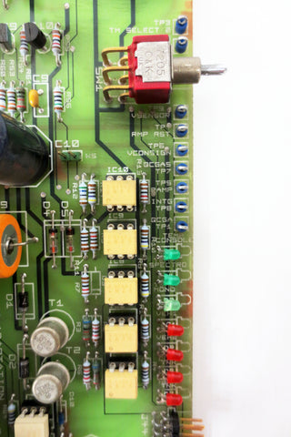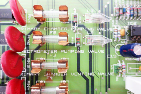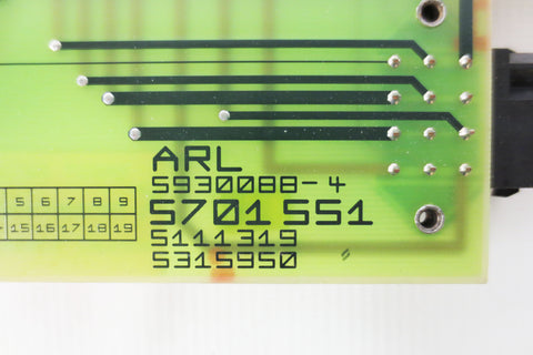 New, no box, inspected and working. Thermal tank regulation board by Applied Research Laboratories/Fisons model 5701551, 5930088-4. Has a 64-pin (2 rows) DIN connector, a 6-pin (2 rows) for power distribution and two 12-position connectors to spectro valves. Several areas are identified on the board: Primay chamber pumping valve, spectrometer pumping valve, primary chamber venting valve, sample rotation, therm fans and thermal water valve.