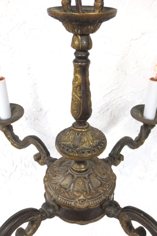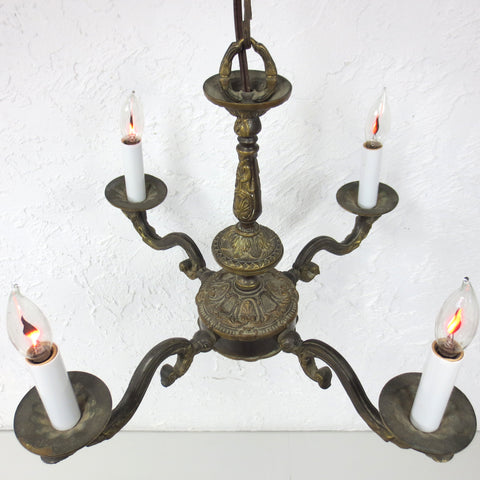 Excellent condition, rewired and ready to plug in. Heavy ornate brass, very clean, patina preserved. 4 new flame style light bulbs, new candle covers and a long ceiling steel chain included. Chandelier measures 14 X 14 X 14 inches, is complete and original, comes from an old Victorian home in Montreal (Quebec, Canada). Total weight 8 pounds.