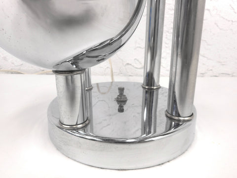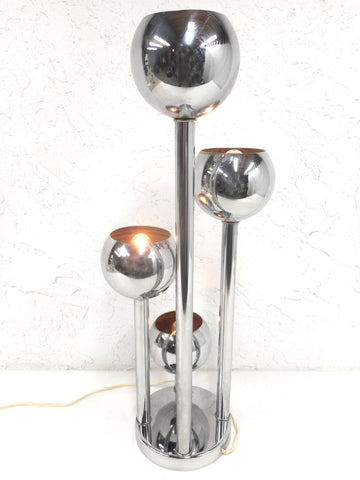 Christmas liquidation ends on the 31st. Spectacular design, excellent condition, very clean. Authentic mid century table light, Reggiani or Eames style, unsigned. Light switch allows to open 1, 3 or 4 lights. Measures 27 inches tall and has a total diameter of 10.5 inches. Each chrome ball has a 4.75 inches diameter and is supported by an independent chrome pipe. Lamp comes with 4 small round light bulbs.
