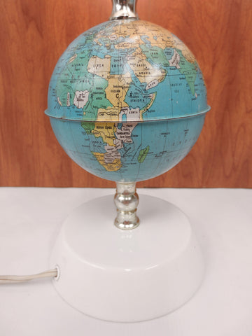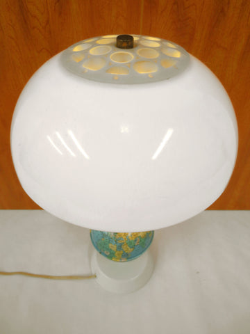 Excellent condition, all original from the 1960's, very clean. Body has a 4.5 inches diameter earth globe, lamp measures 16" tall total, lampshade has a 9" diameter. Lampshade holds directly on the light bulb and has modernist design with holes at the top. Supports 40 to 100 Watts light bulbs (included). Base and earth globe are metal, lampshade is thick plastic. Plugs into a standard North American outlet.