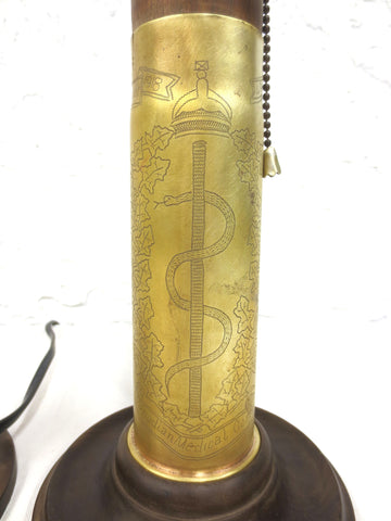 Excellent condition, matching pair, ready to plug in. Polished and rewired, These are authentic brass shells from WWI engraved by the 29th Vancouver Battalion known as CEF (Canadian Expeditionary Force). Bottom of one shell is marked "1915 Patronenfabrik Karlsruhe MRZ 3" with a crown stamp "Ke 11". The other one is marked "AWS 20 DEBR 1892 AW37". Both shells have the same hand engraved art: A crown, beaver, emblem of the Medical Corp, a snake and several leaves. Markings on both are: "August 4th 1914 - November 11th 1918, Overseas Canada Vancouver XXIX Battalion, Canadian Medical Corps." Bottom and top are wood and original, body is brass. Lamps are 13" inches tall each without light bulbs and support up to 250 watts. Shells have a 2.5 inches diameter. Light bulbs in the photo are included.