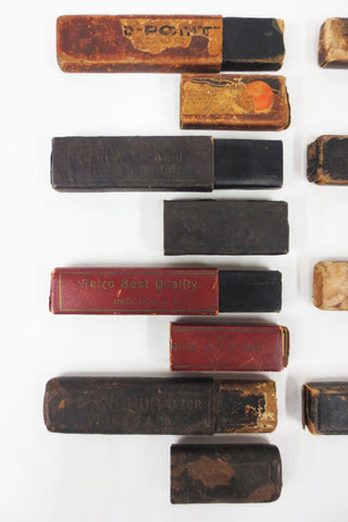 All 8 boxes are signed and identified: D-Pont Côte d'Azur, Canadian King, Reico, Anchor Razor, Noonan Germania, Magnetic Diamond Steel Full Hollow Ground, Boker Unrivaled Razor and L.H. Hebert Montreal Lightning. Both parts of each box match and are original. All boxes open and close easily without being loose. Great for collectors who have loose matching straight razors, increases their value. Can also be used as wall decor in your man cave or salon.