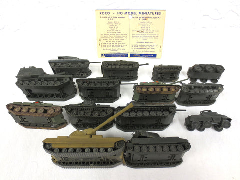 All in excellent condition, no broken parts. The only parts missing are hatches. Several models marked: Conqueror, GB Saladin, T34, Leopard, P III, M 109, SPz.-kurz, M41 and Sturmgeschutz III, . Includes a never opened Field Howitzer M2A1 Cannon. 3 tanks were nicely custom painted. See our store for more ROCO, RMM and Aurora military vehicule lots from the same private collection.