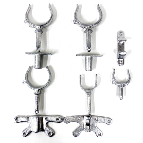 10 Vintage row boat parts, galvanized steel protected with a fresh coat of high quality chrome paint. Sturdy, very clean, no broken parts. Includes: - 1 oar lock marked #3 "M" with a rowlock that fits - 1 oar lock size 3 with a rowlock that fits - 1 oar lock marked #2 with a side mounted rowlock that fits - 1 oar lock 2 3/8" wide with a side mounted rowlock marked #5 that fits - 1 small oarlock 2 1/4" wide and 4 1/4" tall - 5" straight bow chock For boat restoration or to be repurposed as nautical theme hooks for clothing, wall lights and shelves.