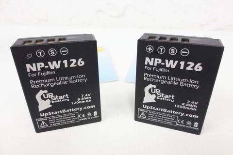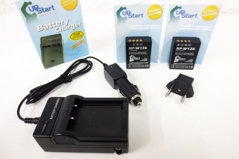 2 new Li-ion rechargeable batteries NP-W126, battery charger, car and Europe travel adapters for cameras Fujifilm X Pro 1, A1, E1, E2, M1 and FinePix HS30, HS30EXR, HS33EXR, HS35EXR, and HS50EXR. Made by UpStart Battery.