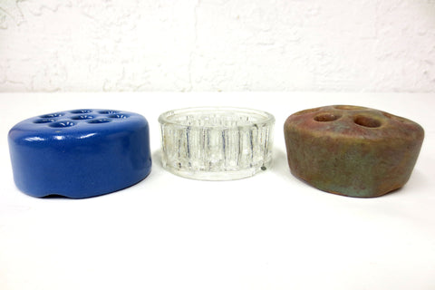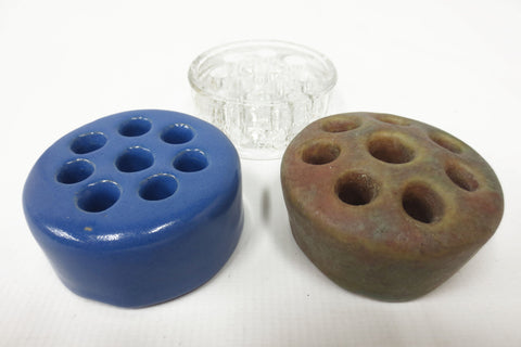 Excellent condition, original colors, no cracks. 2 hand made with ceramic, 1 with glass made in Japan. Vintage flower frogs, 8 holes each. All have a 2 1/2 inches diameter and are 1 to 1 1/4 inches thick. Originally made to hold flowers, frogs are very practical to hold pens, scissors and paint brushes on a desk. Lot #08.