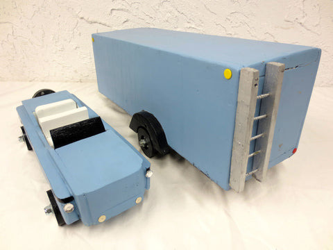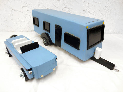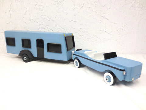 Excellent condition, great design and proportions. The camper and car's color match. The car has a spare tire, white interior and rolls well. It measures 15 inches long and 5.5 inches wide. The camper hooks to the back of the car. It measures 20 inches long and 6.5 inches wide. Hand made, unsigned. Cool folk art piece for a man cave or focus point in a children's room.