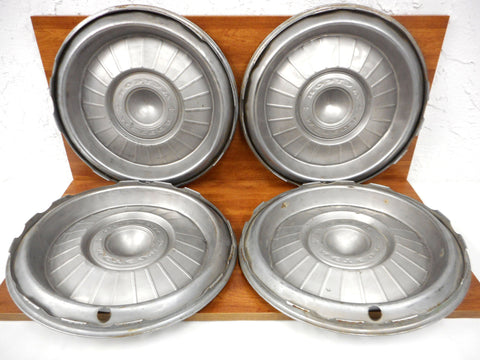 4 original and matching chrome hub caps for a Ford Mercury Meteor 1957 to 1959. All marked Meteor, very clean, black paint still visible. No broken or missing parts, they show dents due to age and use. Great for car restoration or as wall decor for your man cave or garage.