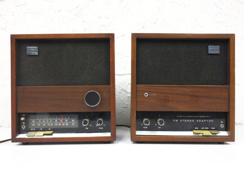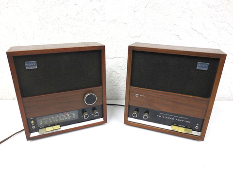 Unique split speaker system, excellent condition, great sound. Right module is marked Automatic Stereo Mono Convertible FM Stereo Adaptor. Wires and electric cord included. Both speakers can also work with four standard D 1.5V batteries. Both speakers are easy to fix to a wall. Marked Sony Solid State 9 Transistor model 8F-48W.