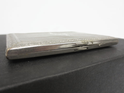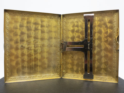 Excellent condition, chrome outside, golden on the inside. Measures 3 X 3 3/4 inches. Case is clean, closes and opens well, no broken or missing parts. Signed Evans. Marked "Compliments Molson's Brewery Limited". Was given to friends of the Molson's Brewery in the 1940's. Light chrome and gold paint fading due to age.