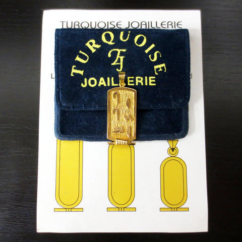 Excellent condition, complete with felt pouch and jewelry coordinates in Cairo, Egypt. Beautiful 18k yellow gold hieroglyphic cartouche pendant, measures 5/8 X 2 1/8 inches (15 X 32 mm), weighs 5.5 gr.