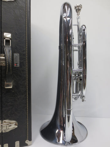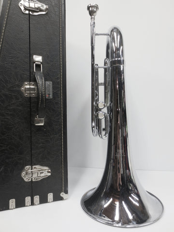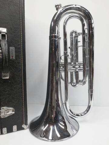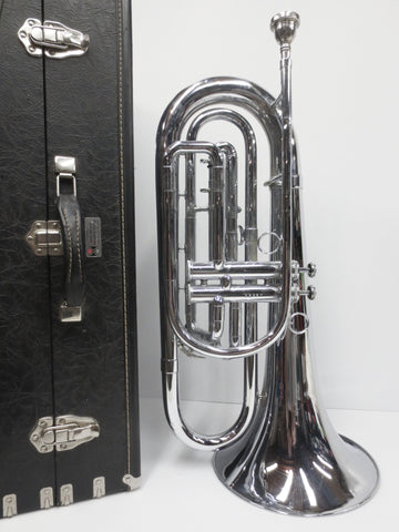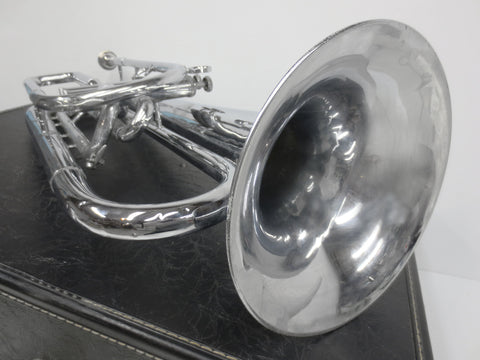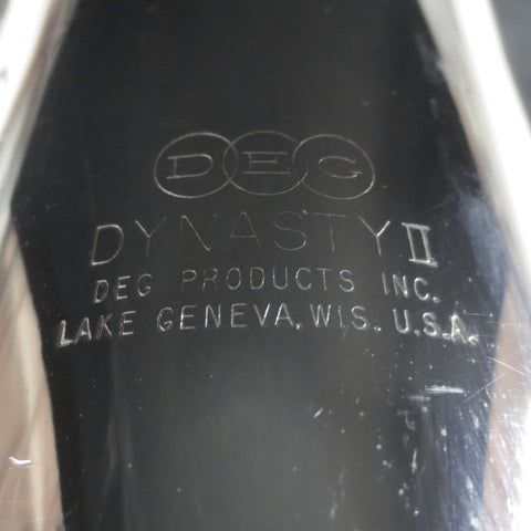 Beautiful Baritone Bugle horn with its original case. Beautiful sound, playable condition. Baritone is marked "DEG Dynasty II, DEG Products Inc. Lake Geneva, Wis. U.S.A". The mouthpiece is included and marked "Dynasty 6 1/2 AL". This baritone is very clean but does have few small dings.