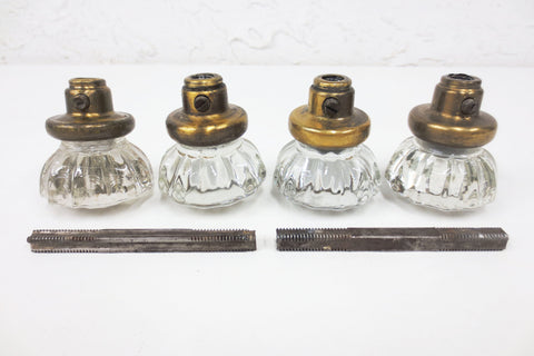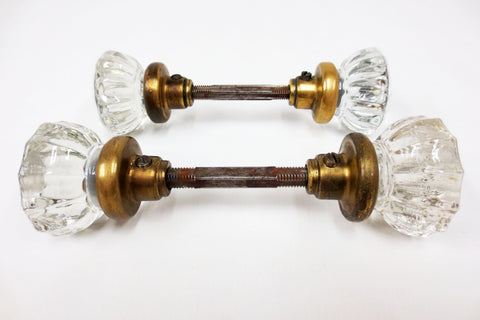 2 complete pairs with screws and rods, matching glass knobs and base shapes. Authentic antique Victorian door knobs. Ready to install, professionally cleaned, patina preserved. 12 points crystal glass, 2 inches diameter, no chips, no stains. Heavy metal and brass bases. Salvaged from a Victorian house in Montreal, Quebec, Canada. Several more sets in store for your home restorations. Lot #1.