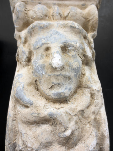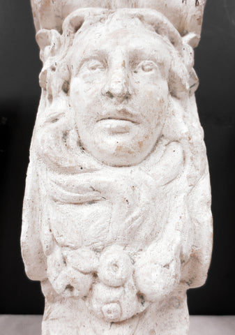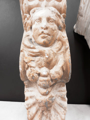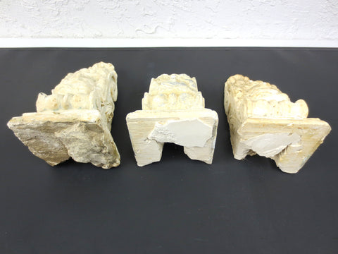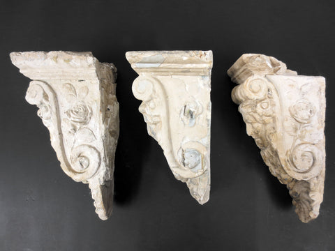 Matching set of 3, salvaged from a Victorian home in Quebec, Canada. Authentic, unrestored, original patina preserved. They each measure 9 to 10 inches and are 5 inches wide. These unique corbels are still sturdy but do show chips and cracks. Ideal for a fireplace, living room shelves or to enhance your ceiling.
