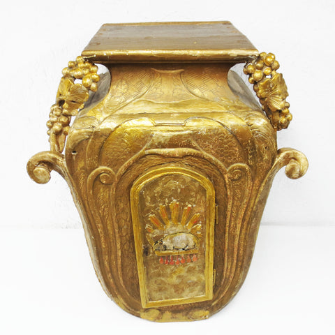 Authentic 1880's rural church Tabernacle from Quebec. 33 inches tall, hand carved from a pine tree trunk, shaped like a wine urn. Door has a unique carved lamb with 7 blood drops and a golden crown. Original hand forged key and working lock, door doesn't close completely due to age. Tabernacle is built with hand forged nails, has its original gold paint with carved wine grapes and leaf ornaments. Inside has its original turquoise paint. Weighs 61 pounds and measures 27 3/4 X 15 X 33 1/4 inches.