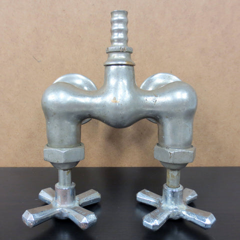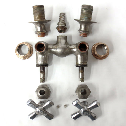 Fully functional, all parts clean and easy to disassemble. Salvaged from a Victorian house in Montreal, Quebec, Canada. All nickel plated solid brass. Authentic claw foot tub faucet signed Mueller from the early 1900's. Matching Hot and Cold knobs, each measures 2 5/8 X 2 5/8 inches. No rust, nickel plating still in good condition, minor dings. Easy to wall mount to 3/4" male pipes. Faucet measures 5 3/8 inches wide and is 6 1/4 in tall. Behind the wall section measures 1 1/4 in.