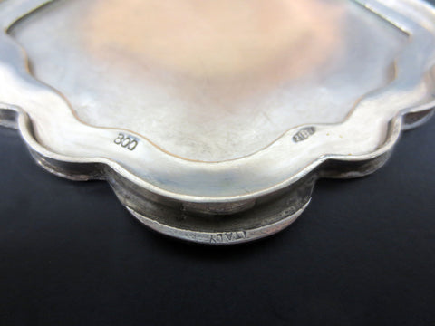 Mint condition, opens and closes well. Marked Italy 800 Silver with the makers emblem. Measures 3.5 X 3". Beautifully engraved shell shape on both sides. Original powder net still inside. No mirror found. Left untouched for collectors. We can remove the powder net and add a mirror upon request.