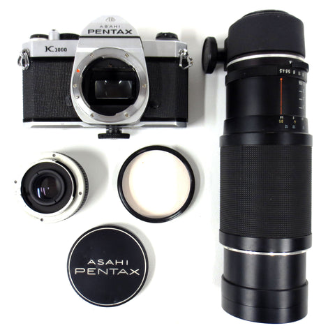 • A clean, complete and working Pentax Asahi K1000 35mm camera. Meter is untested, no battery, sold as is.