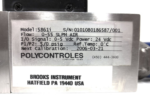 Fully functional, original tags, very clean. Mass flow sensor for air by Books Instrument, model 5861 i Series. Includes two stainless steel fittings. Flow rate: 55 SLPM. Gas: Air. Ref. temp 0°C. I/O signal: 0-5 Vdc. Power: 24 Vdc. P1/P2: 5/0 psig. 1500 psig max. Base is model 586li. Pre-owned and tested industrial surplus from a closing plant in Quebec, Canada. Minor surface scratches only.
