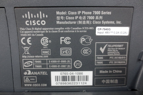 Refurbished and very clean, 12 pages manual included (pdf). Cisco IP phone model 7940 CP-7940G with its original adjustable footstand and handset. Large 4 X 3 inches LCD screen, quick footstand adjustment button, can also be screwed to a wall. Features: Programmable button, shows call features on screen, messages, directories, services, help, settings, volume headset, mute and speaker buttons. Supports a variety of power supplies 48V, 0.38A (not included). All units available are in the same condition (see our photos): Fully functional, professionally cleaned, very light scratches only, no broken parts. Phone weighs 1.19 kg and measures 11 X 8 1/2 X 4 inches when footstand is closed.