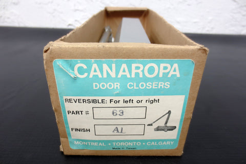 New, open box, hardware bag still sealed. Compact door closer model 63 by Canaropa, reversible from left to right, aluminum constructions. Total weight 2.3 kg, box measures 12.5 X 3.5 X 4 inches.
