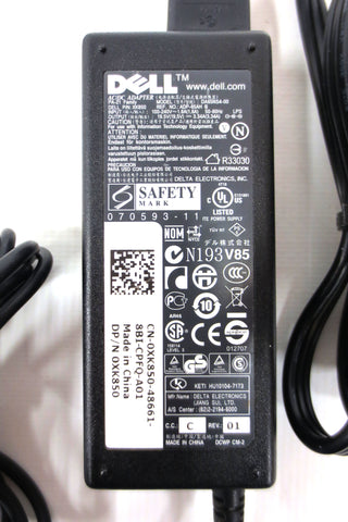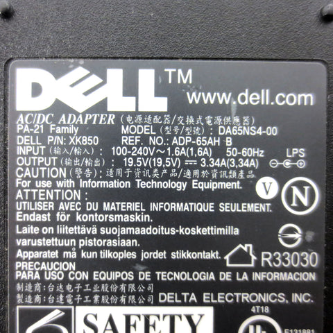 Like new, original Dell AC/DC adatper. PA-21 family, part number XK850, model DA65NS4-00. Output: 19.5V, 3.34A. Input: 100-240V, 1.6A, 50-60Hz. Power cord included.