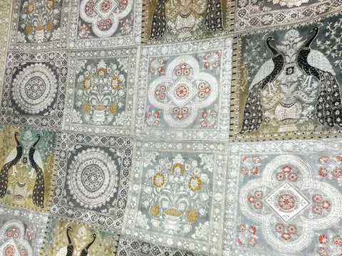 Excellent condition, high quality silk, handmade. Beautiful embroidered peacocks and flowers. Gold, pink, green and black threads. Patchwork of 4 different patterns. From Southeast Asia, possibly India. Light surface nail marks on back due to hanging. Measures 47 X 47 inches.