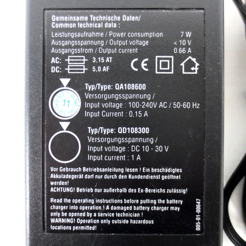 Fully functional battery charger made in Germany by HBC Radiomatic. Model QA108600 / QD108300 for batteries BA223030 and BA223000. Plugs into a standard type A electrical outlet.