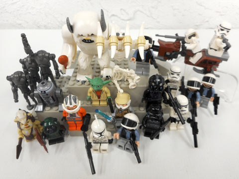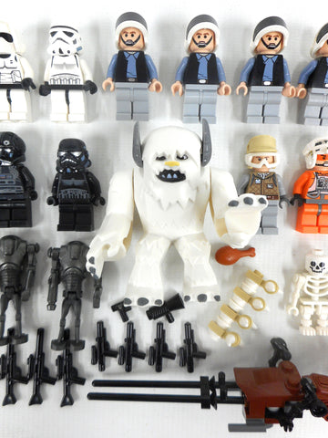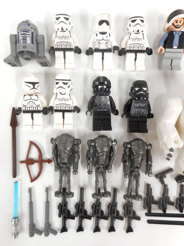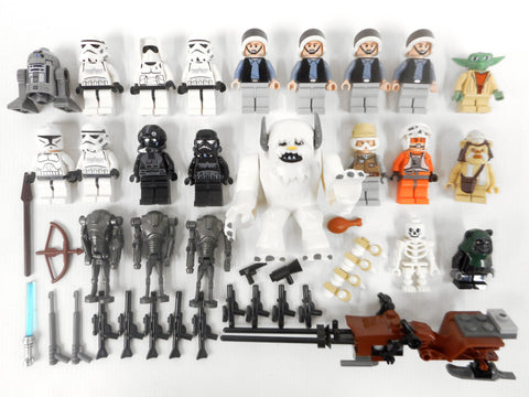 All 22 minifigures and 19 accessories in excellent condition, very clean, none broken. Includes all 4 Hot Wampa 8089 minifigures: Snow monster with his chicken piece and large bone ribs, white cave skeleton, Zev Senesca and Luke Skywalker. Also includes 1 Yoda, 2 Ewoks, 1 Imperial V-wing Pilot, 1 Death Trooper, 1 Astromech Droid, 3 Battle Droids, 1 Clone Trooper, 3 Storm Troopers and more.