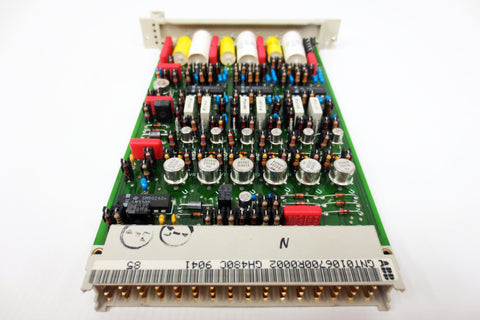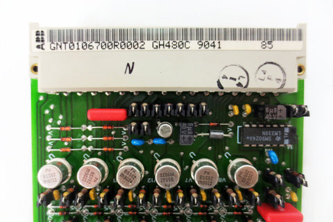 Like new, inspected and functional, no box. Surplus from an aluminum manufacturer. Barrier control circuit board card by Brown Boveri / BBC Electronik, model GH480C, GNT0106700R0002 GH480C 9041. Measures 7 1/2 X 5 1/8 inches.