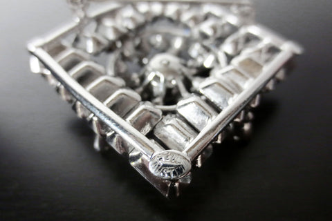 Excellent condition, vintage evening dress brooch signed Azub Austria. Square shape, 1 1/2 X 1 1/2 inches, amber and white glass stones. Silver rhodium plated base. Beautiful flower shape, sturdy holding pin.