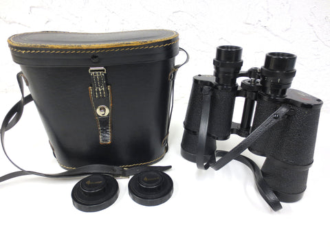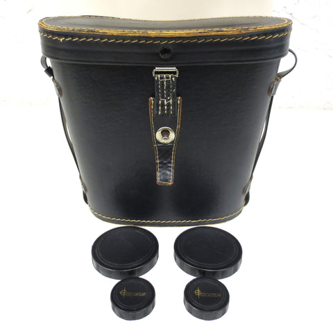 Excellent condition, very clean, fully functional. Original leather case and 4 lens caps. Powerful binoculars signed Carl Wetzlar, 7 X 50 Marine, 372 ft at 1000 yds, coated and lumenized. Serial No. J-9 70781. Cast and binoculars each have their own vinyl neck strap.
