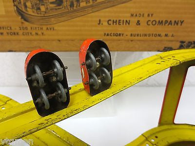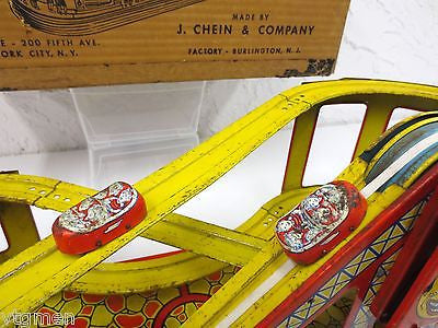 - Box is marked "No. 275 Roller Coaster Mechanical, Made by J. Chein & Company, Factory - Burlington, N.J., Sales Office - 200 Fifth Ave. New York City, N. Y."