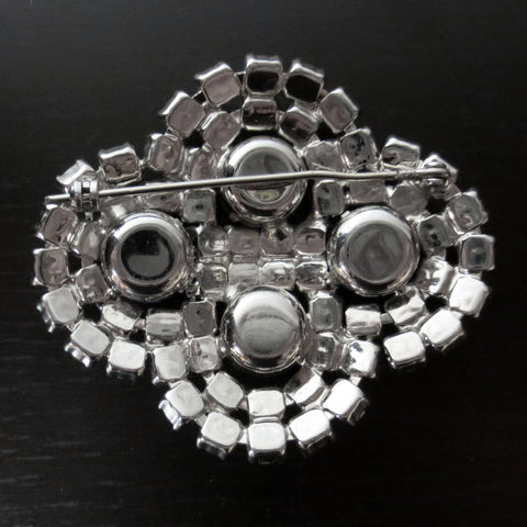 Excellent condition, large 2 1/4 X 2" vintage evening dress brooch. Light blue glass stones, silver rhodium plated base. 4 symmetrical circles that converge. Great for a chic evening out.