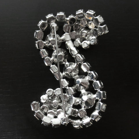 Vintage Evening Dress Brooch S Shape 2 3/8" Glass Stones, Silver Rhodium Plated