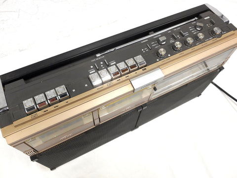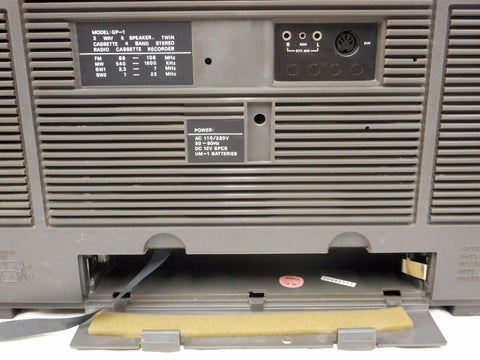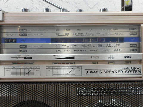 Very clean, works perfectly, powerful. Measures 20 X 11. Signed "Eversonic Model GP-1 3 Way Speaker System". Dual cassette tape, recorder, tape fader, dubbing, FM, SW1 and SW2 and M2.