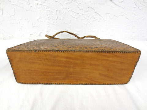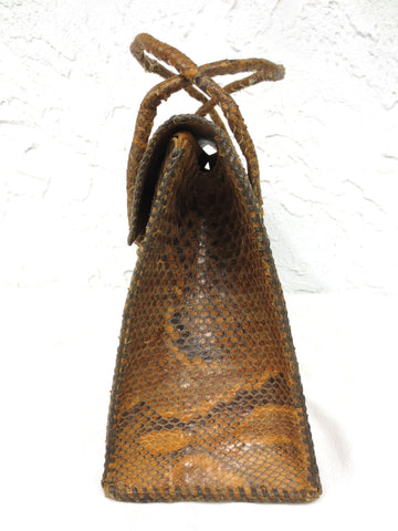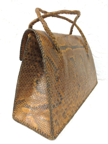 Genuine python snake skin, classy design and excellent condition. Vintage purse, no signature. Measures 14" at the widest, 8.5" tall and 5" deep. It has three very functional leather compartments. Purse is sturdy and stands on its own on a table.