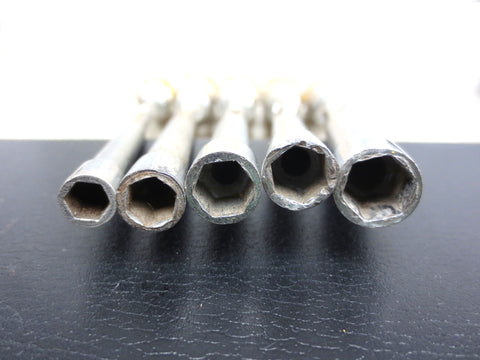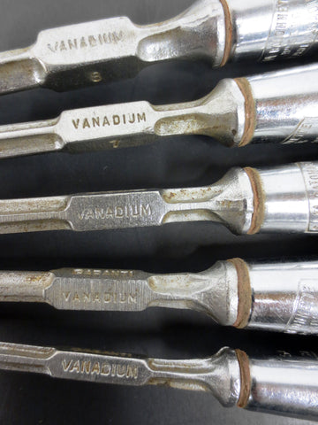 High quality, chrome vanadium plated, excellent condition. Long wood handles with Sam's original emblem. Hexagonal screwdrivers numbers 5, 6, 7 (2) and 8. Each one is signed "Sam Baïonnette Bte SGDG Chrmolvanadium". Longest measures 11 inches, shortest 10 1/4 inches.